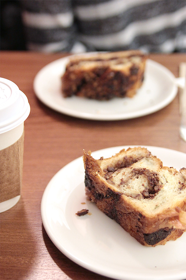 It was a tough decision, but Sheri chose a classic chocolate walnut babka, while I went with the more unusual-sounding whisky pecan babka.