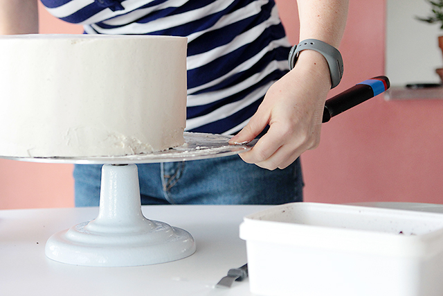 tool against the side of the cake and gently spin the turntable to smooth the frosting. Go all the way around the cake.