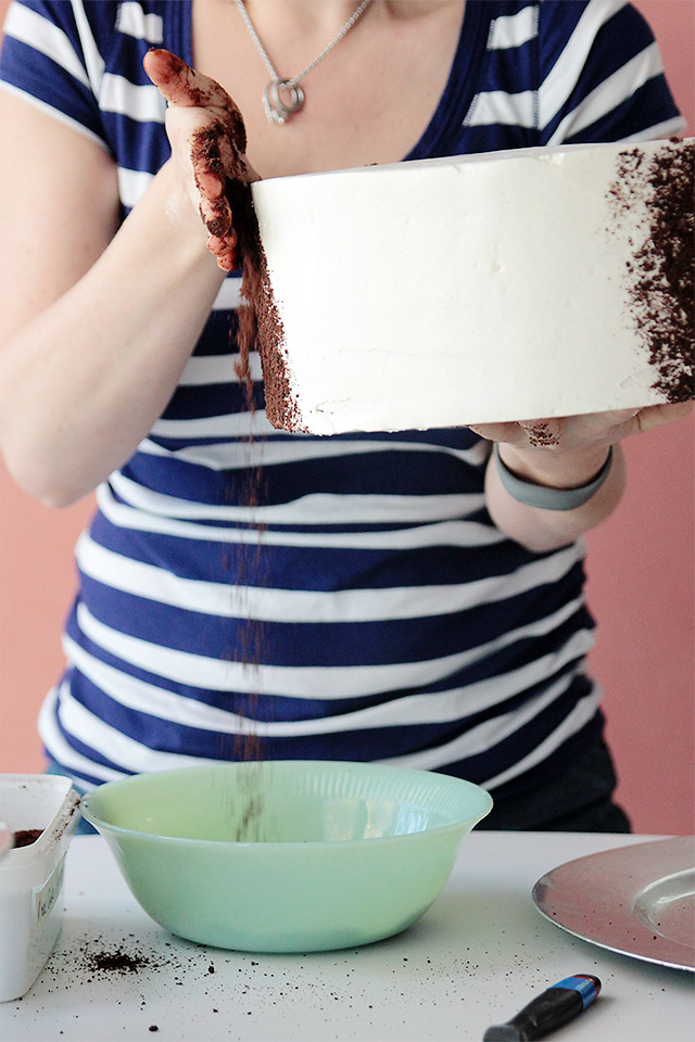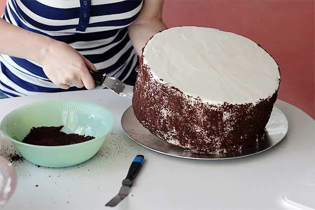 To remove the cake from the turntable, gently slide your spatula underneath the cake to help push it onto your hand. At this point you could simply place it on a serving plate, pop in some candles, and call it a day… or you can take it to the next level by adding decorative icing and chocolate cake crumbs.