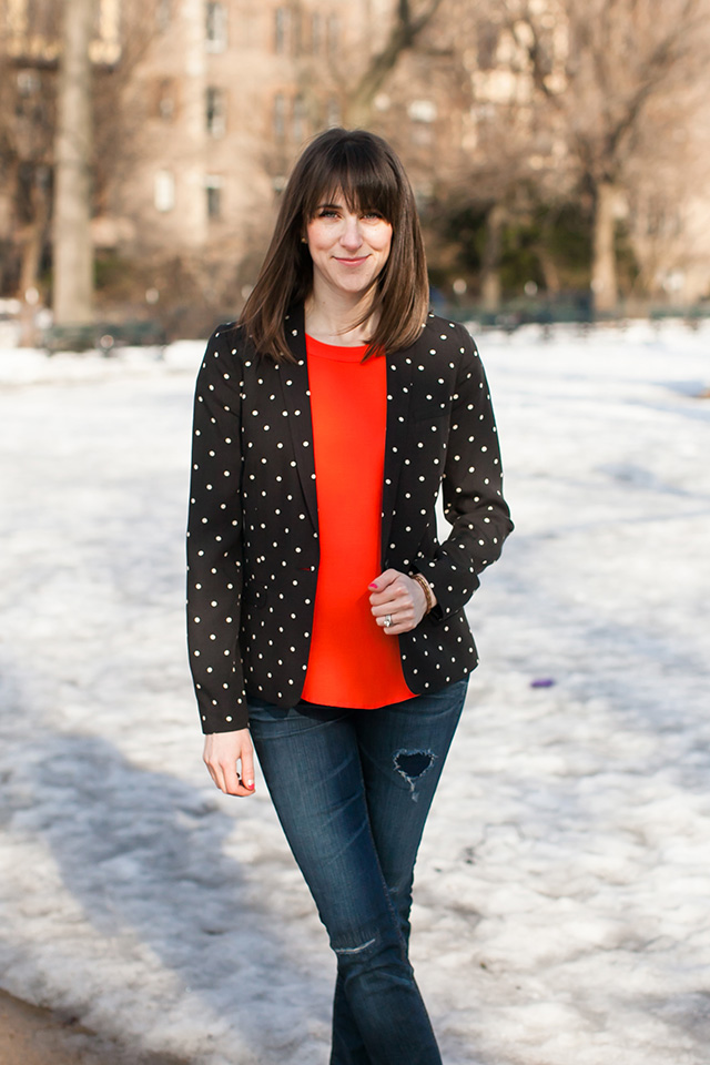 This month, while it’s still a bit chilly outside, I’ll be pairing the brightly colored tee with a blazer. I love the way black and white makes the coral pop! My favorite wedge ankle boots finish the look.
